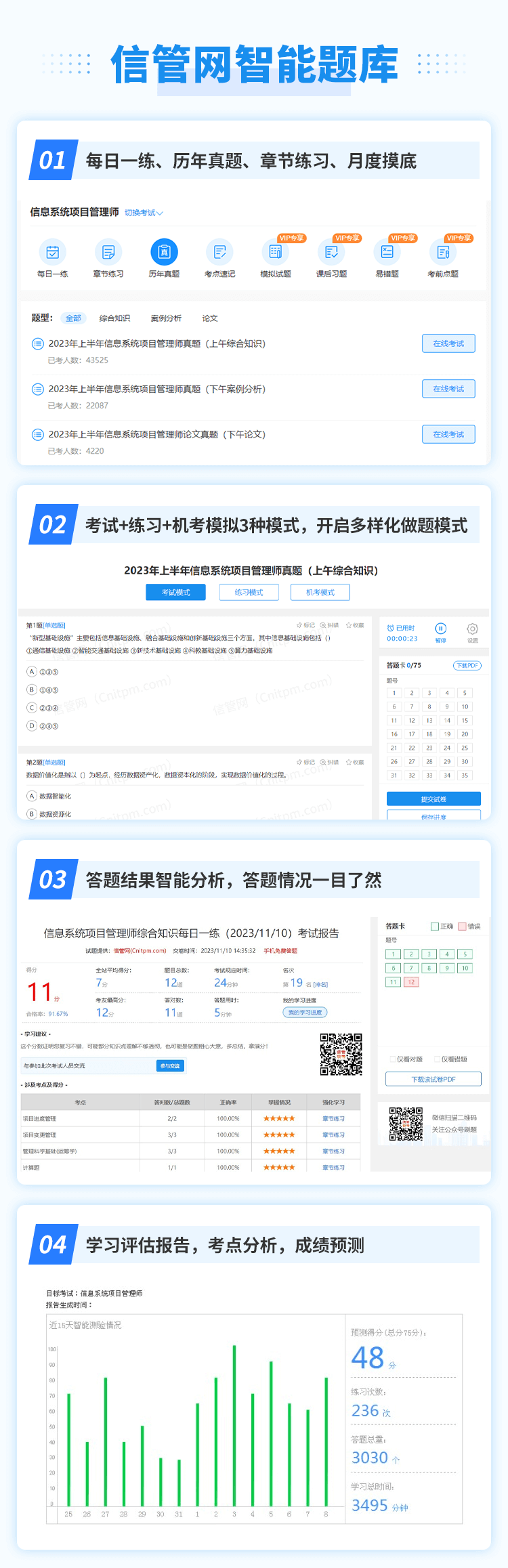 信管網(wǎng)為信息化考試與服務專業(yè)平臺,目前開設有信息系統(tǒng)項目管理師、系統(tǒng)規(guī)劃與管理師、系統(tǒng)集成項目管理工程師、信息安全工程師考試與學習服務。提供了包括考試報名、考試課程、成績查詢、真題發(fā)布、資料下載、案例分析、論文、考試教程、在線題庫、每日一練、章節(jié)練習、信管人才、論壇交流等服務。我們將為廣大信管考友提供專業(yè)、及時、全面、貼心的考試服務,立足于為廣大信管考友建造一個優(yōu)質(zhì)的學習平臺,讓考生都能夠享受學習,順利通關。